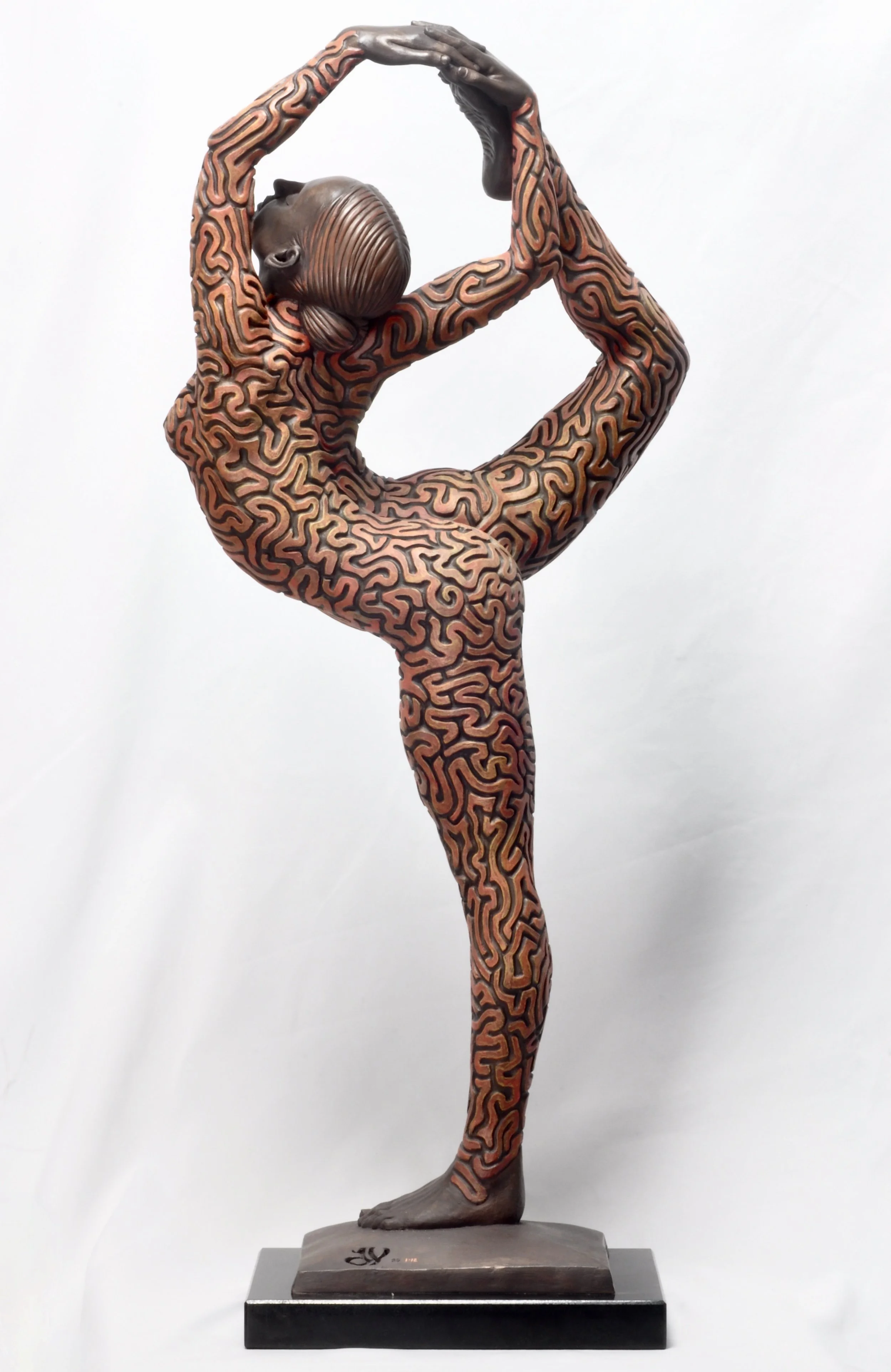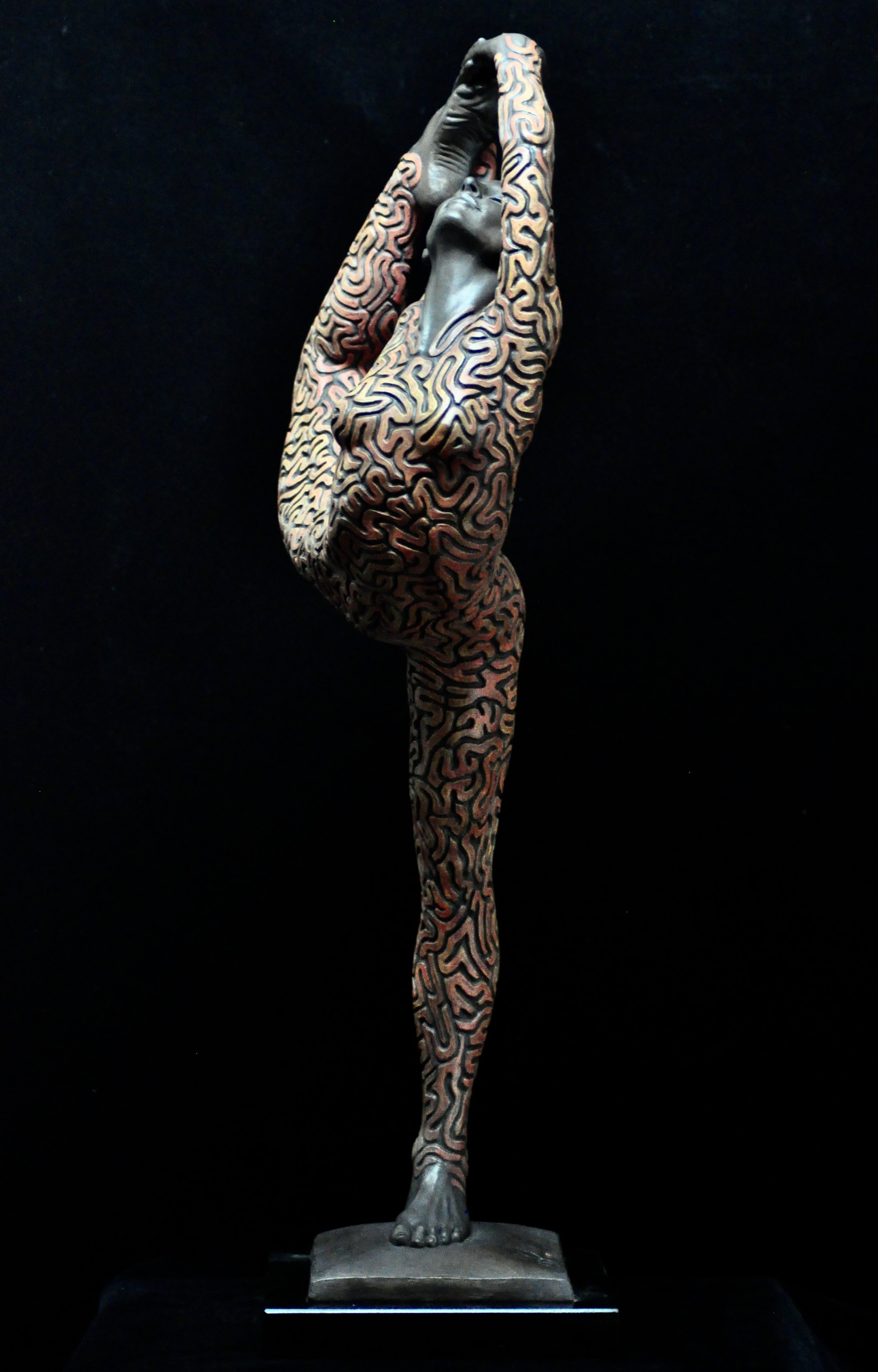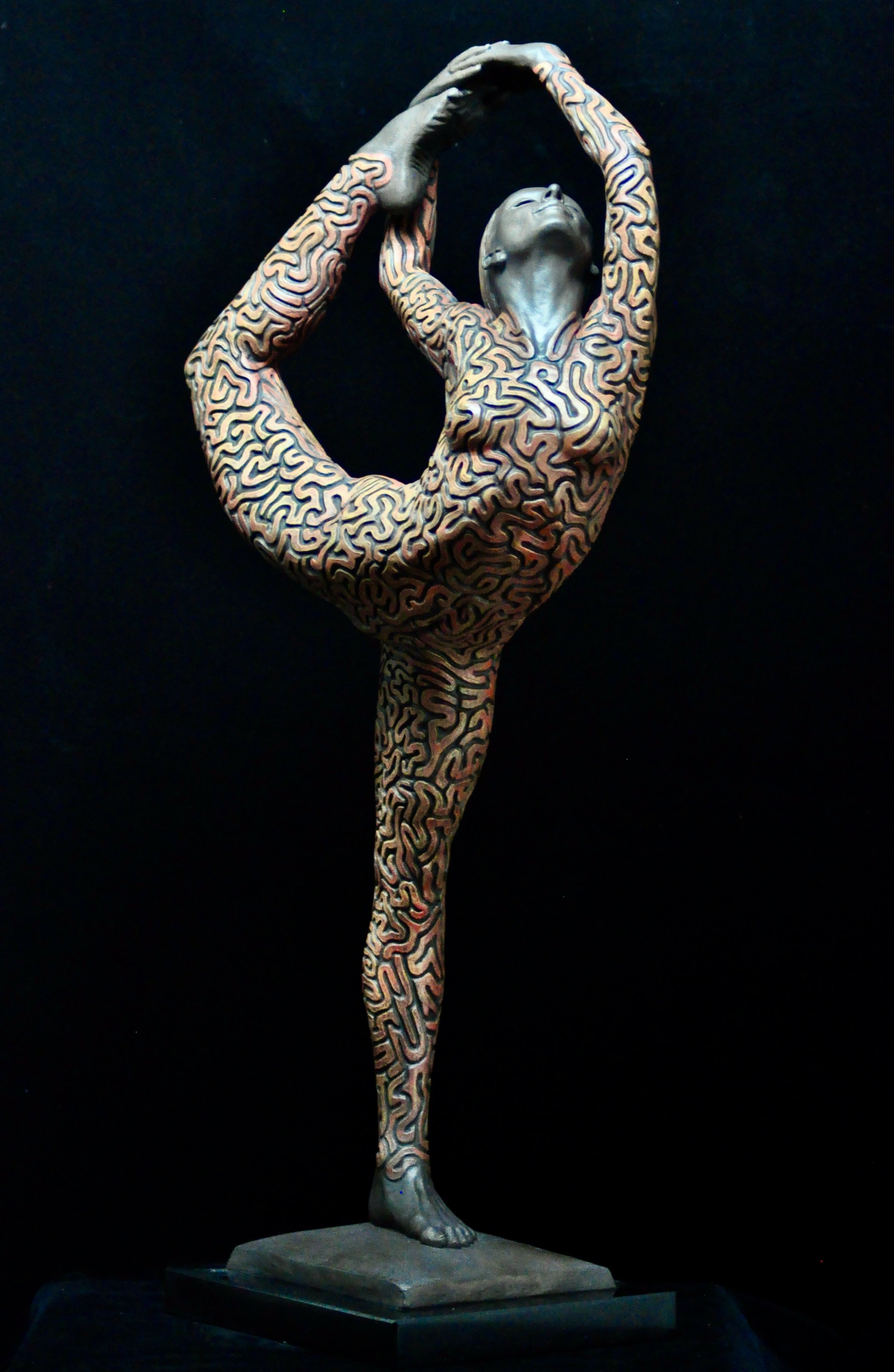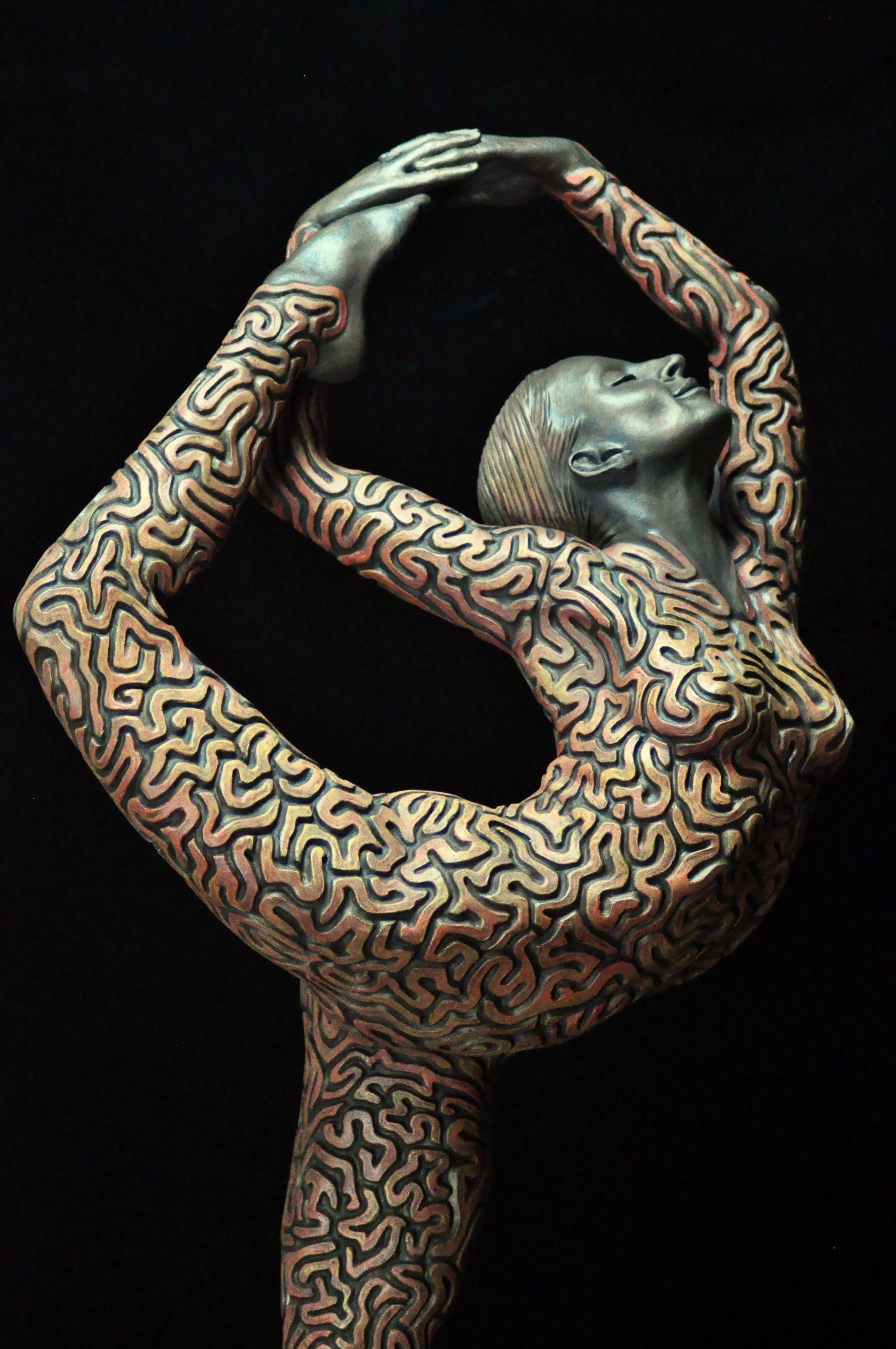 ‘Labyrinthine’ was another sculpture born out of the photo shoot with Danielle Cato. After we had cover the shots to go with my sketched designs, we had more time in the photo studio. So I think this sculpture came about after I asked Danielle to do some poses she particularly liked. I immediately asked my photographer friend Chris to do as many shots as I needed for this pose as I knew immediately, I’d like to sculpt it. The question was, what did I want to do with it as far as texture was concerned. It had percolated in my head for some time that I liked the idea of doing something more abstracted, but even that needed to be influenced by something natural. I had found images of brain coral, and I’d distinctly remembered seeing it and being fascinated by it when scuba diving in Australia many years before. So when I actually saw a large dried out piece in a museum cabinet in Osbourne House, Isle of Wight, I saw it as confirmation I was on the right path. I wanted the brain-like forms to echo the pose itself, so after drawing the coral patterns onto the figure, I then separated them into smaller shapes, giving a maze-like effect all over the figure. The title came easy ‘Labyrinthine’ = Physically resembling a labyrinth with the qualities of a maze.