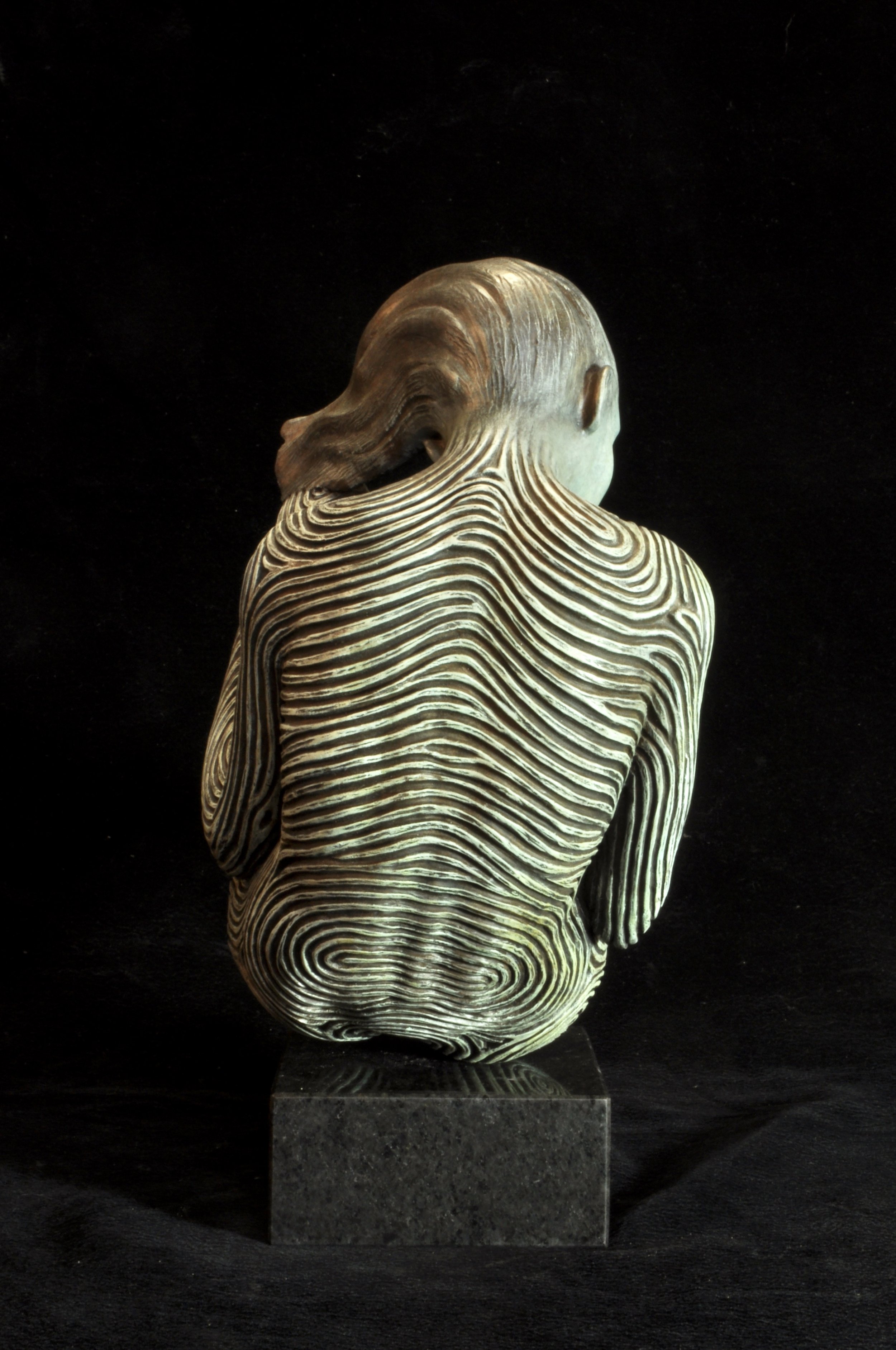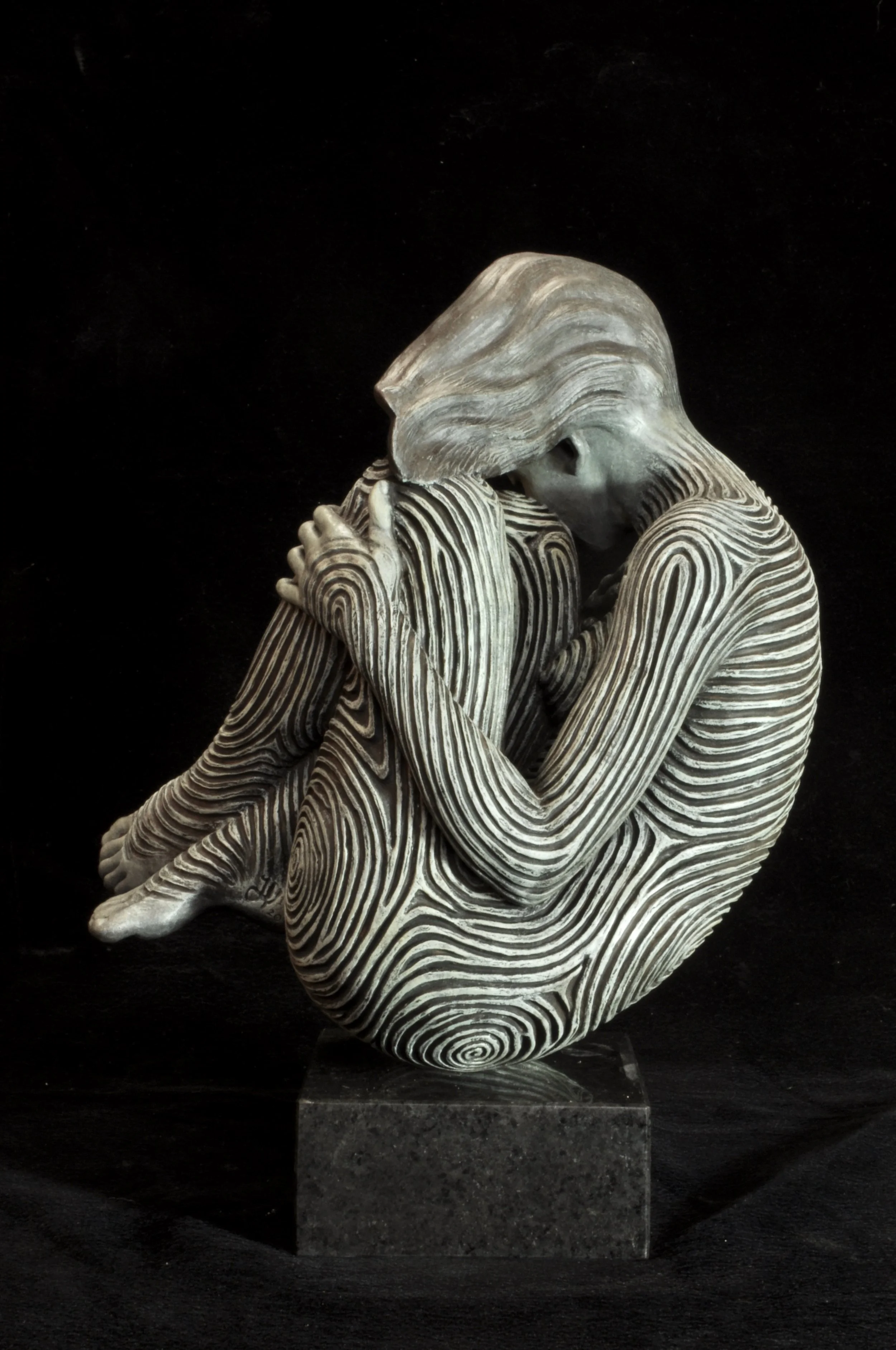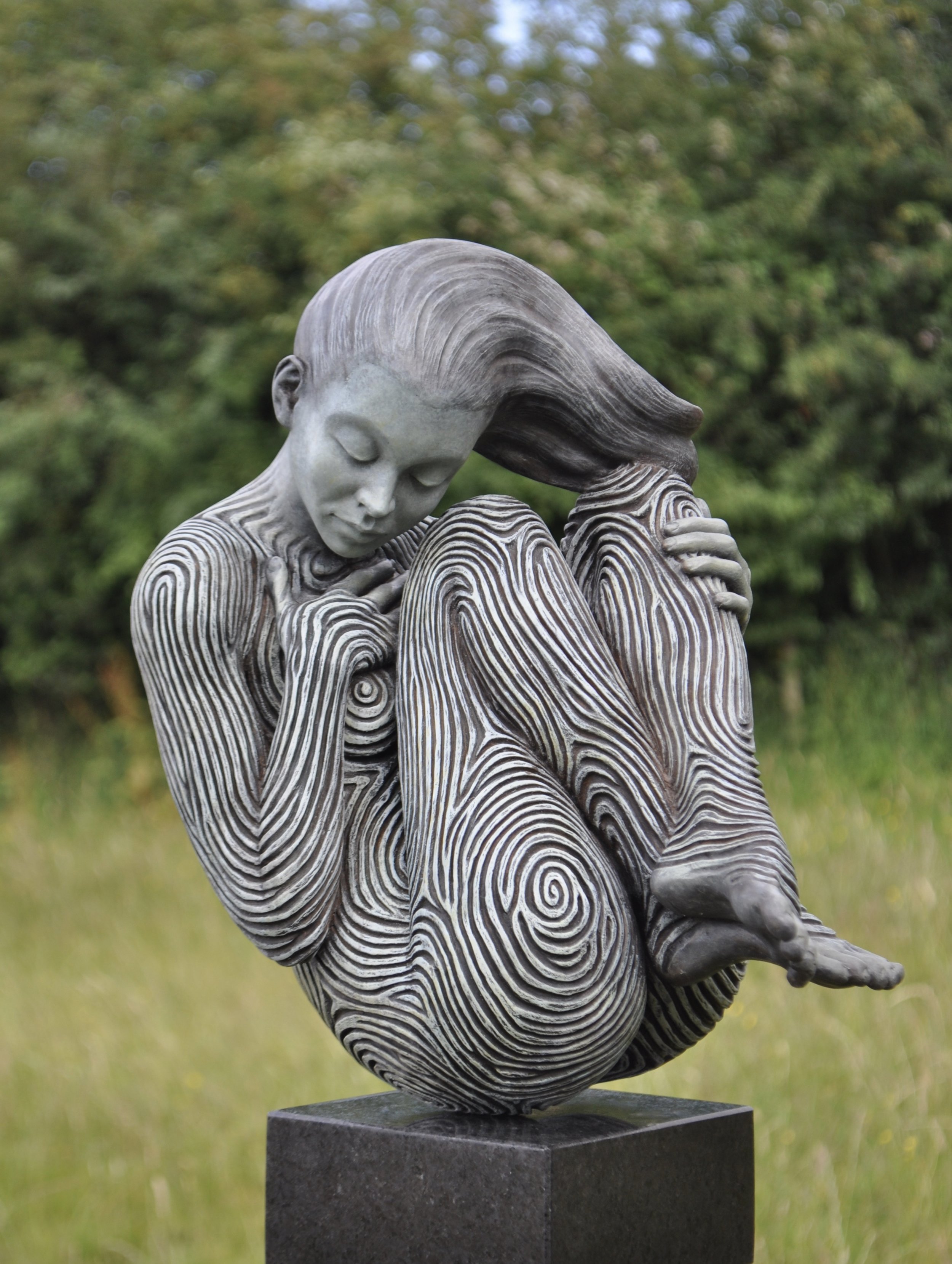 My figure rests in a place of tranquillity in the foetal position. I read that human fingerprints are formed when we’re a tiny developing baby in our mother's womb. And so I used the fingerprint valley patterns of the whorls, loops and arches to cover her, that make us unique.